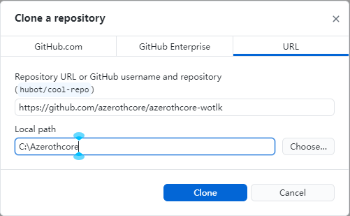 点击 Clone. 几分钟后, Azerothcore 的源代码将被克隆到 C:\Azerothcore.